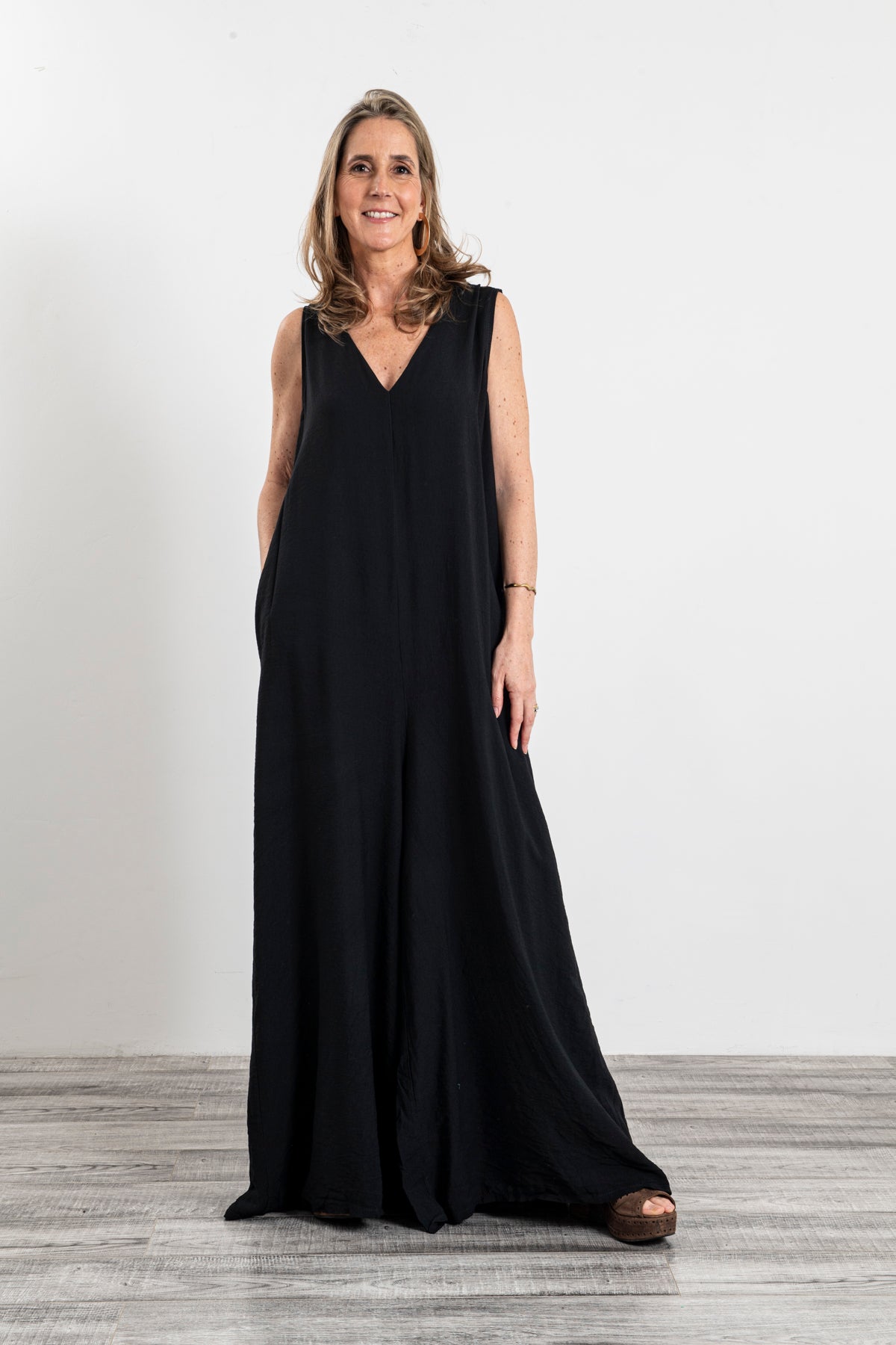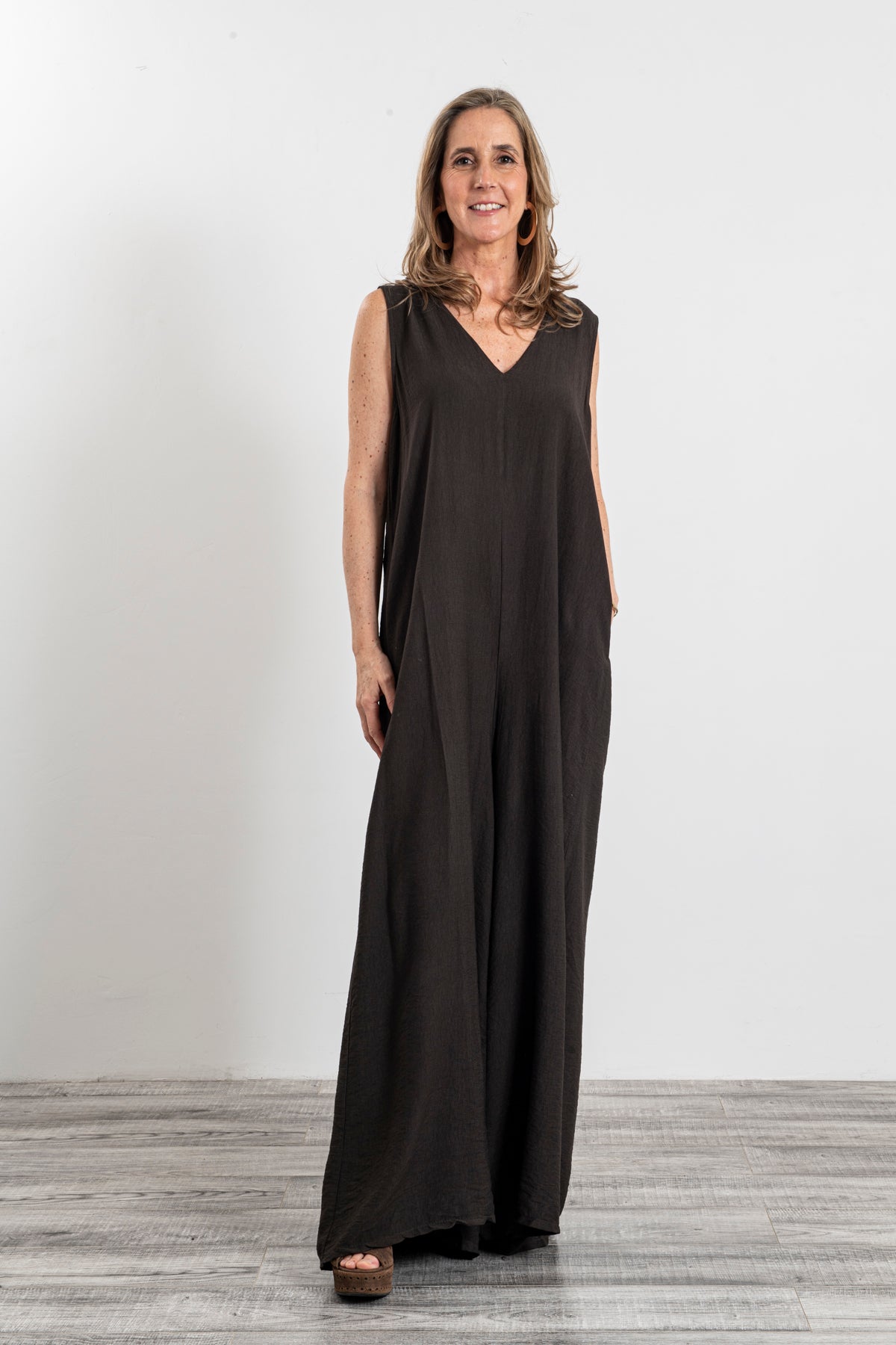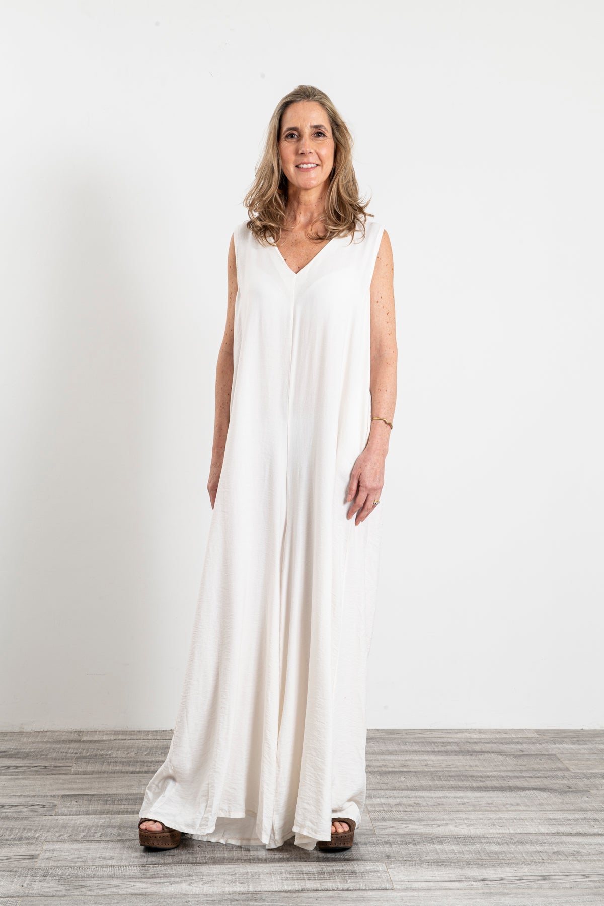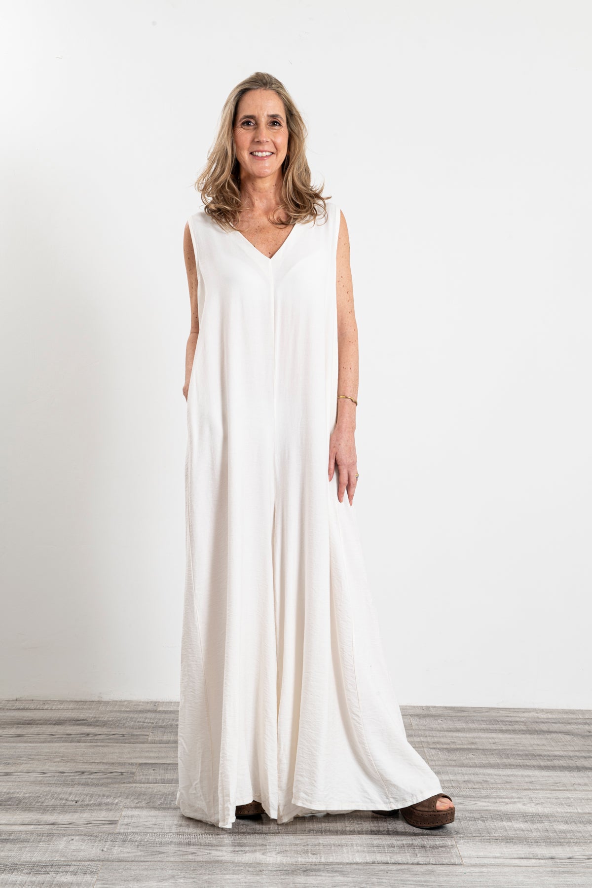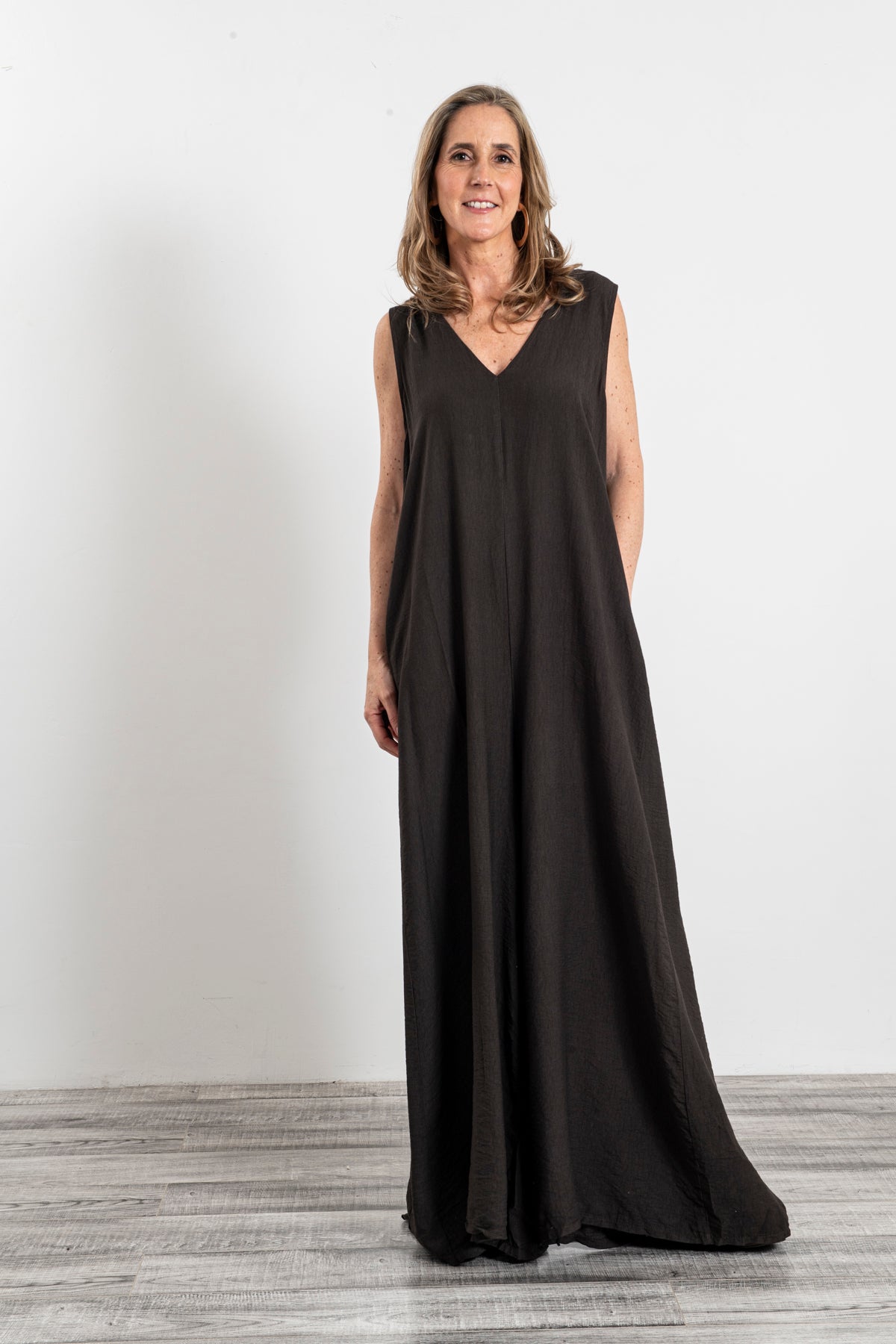 enterito largo sin manga cuello v con pliegue en espalda, tela fresca y de muy buena caida.