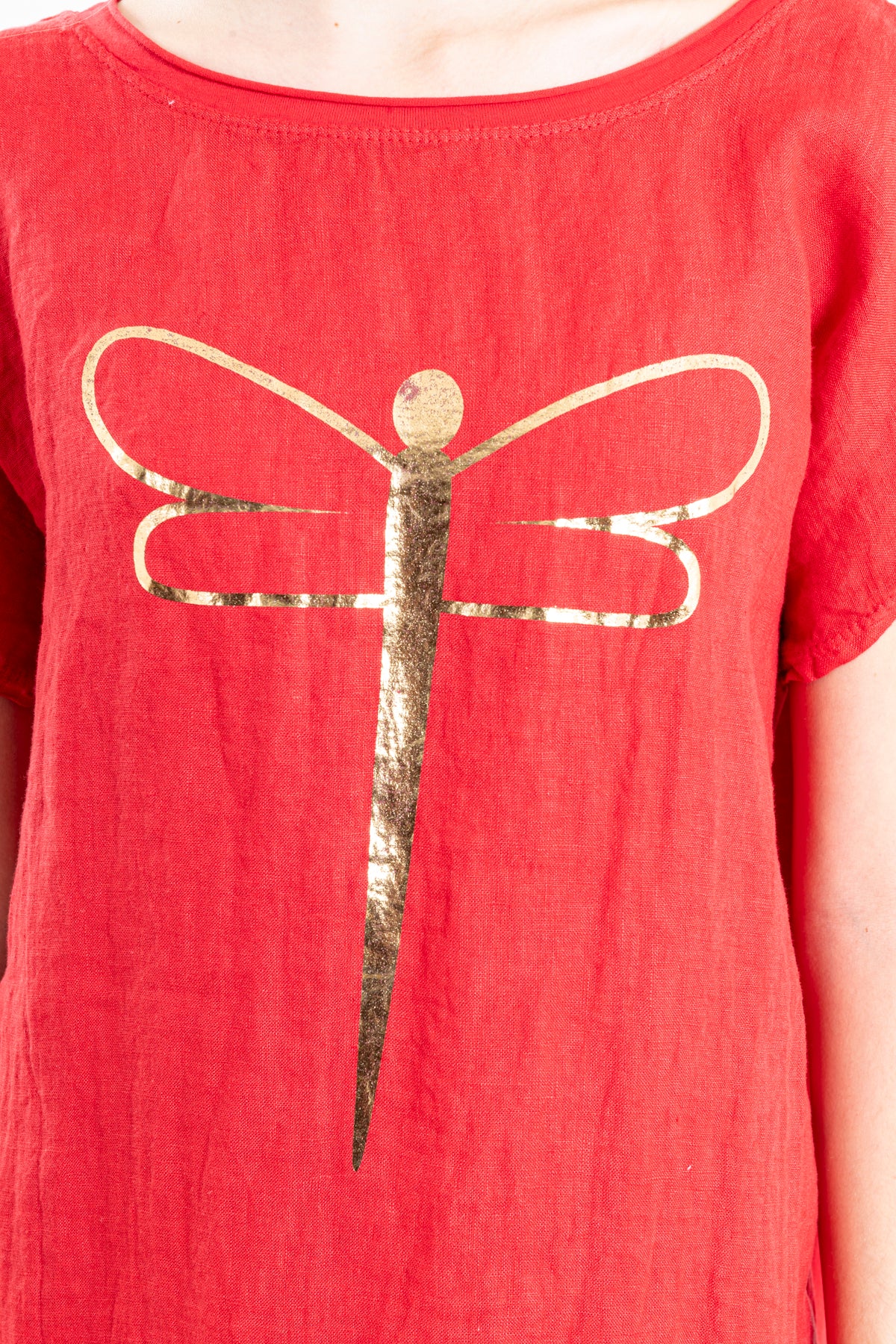 vestido lino corto con estampado libelula manga corta, frente lino, espalda algodon que le da flexibilidad y frescura.